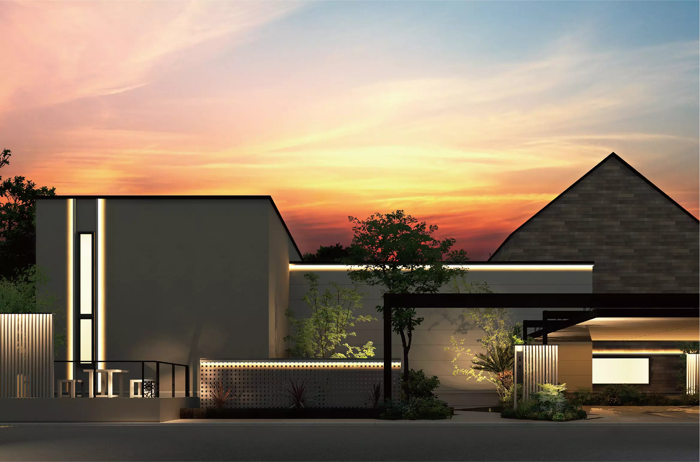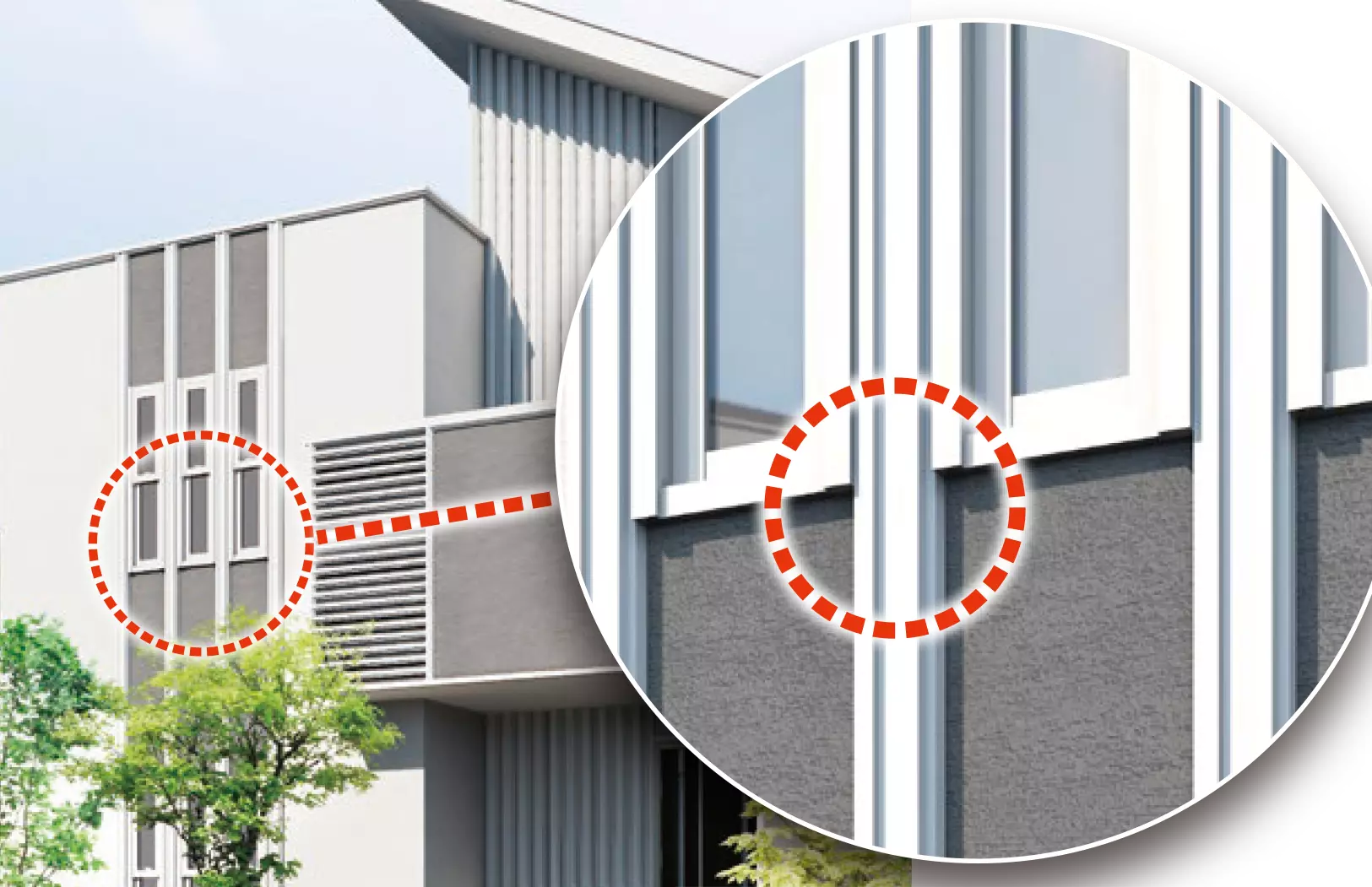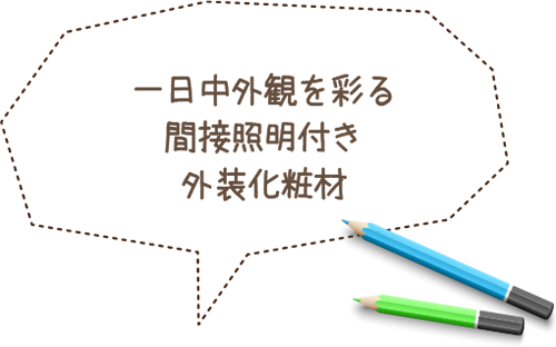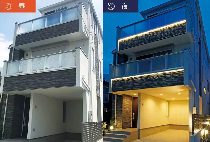 日中は外装化粧材として外壁と一体感のある陰影を生み出し、夜間は間接照明として建物の外壁を美しく照らすため、一日中外観を彩ることができます。