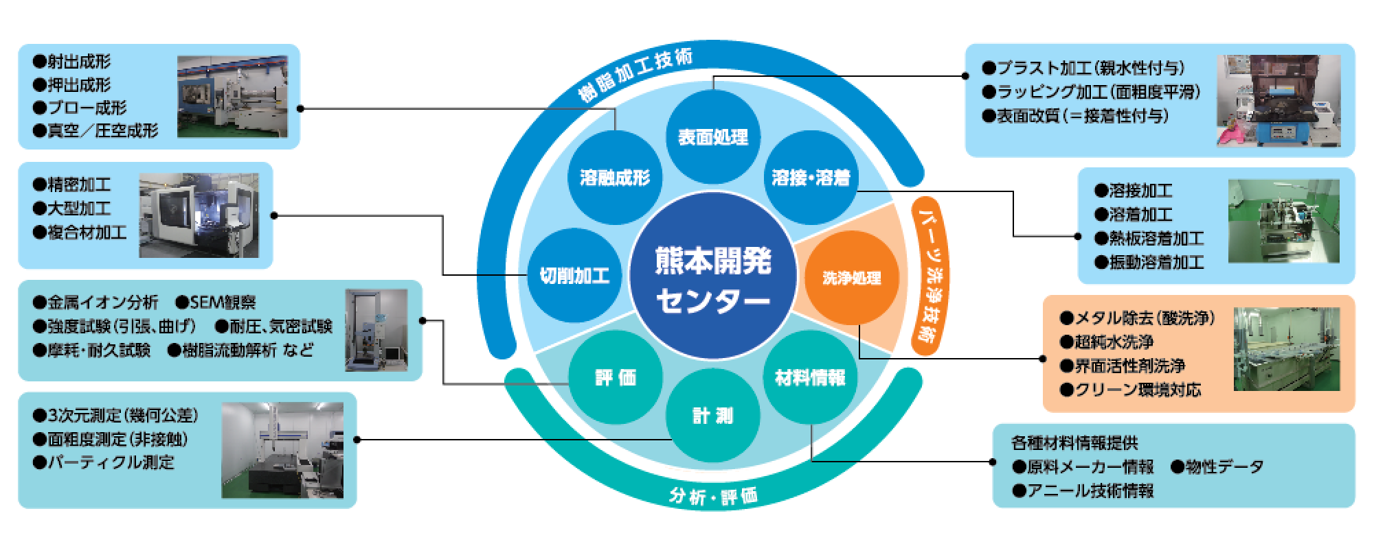 高機能エンジニアリングプラスチックから汎用樹脂まで、様々な樹脂製品に関して多様な加工技術で対応します。開発から試作、分析評価は熊本開発センターで行い、開発段階から総合的にサポートできる体制を整えております。
