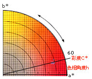 H*は、a*はプラス方向の軸を0°とし、時計と逆周りの角度で現しC*は原点からの距離で表します。